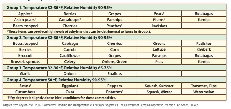 Multi-commodity cold storage warehouses are used for storing a wide array of food products and fresh produce (fruits, vegetables, dairy products, meat, poultry, etc.) that require different temperatures and storage conditions. You may have a look at the given table to know about the storage compatibility of different fruits and vegetables.